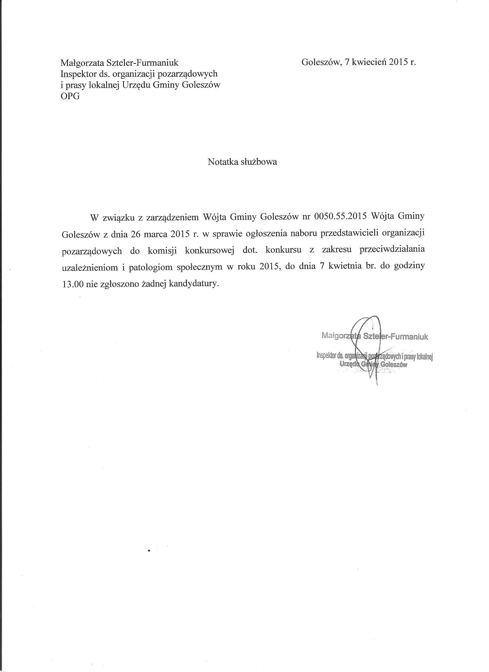 W związku z zarządzeniem Wójta Gminy Goleszów nr 0050.55.2015 Wójta Gminy Goleszów z dnia 26 marca 2015 r. w sprawie ogłoszenia naboru przedstawicieli organizacji pozarządowych do komisji konkursowej dot. konkursu z zakresu przeciwdziałania uzależnieniom i patologiom społecznym w roku 2015, do dnia 7 kwietnia br. do godziny 13.00 nie zgłoszono żadnej kandydatury.