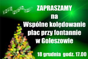 Serdecznie zapraszamy mieszkańców i sympatyków Gminy Goleszów do wspólnego kolędowania przy choince bożonarodzeniowej, które odbędzie się 18 grudnia 2016 r. o godz. 17.00 na placu przy fontannie w Goleszowie. We wspólnym śpiewie wspomogą nas chóry Parafii Katolickiej i Ewangelicko- Augsburskiej z Goleszowa, uczniowie Szkoły Podstawowej i Gimnazjum w Goleszowie oraz Zespół Pieśni i Tańca „Goleszów”. O godzinie 16.00, przy fontannie, rozpocznie się „Kiermasz Goleszowski” na którym będzie można zakupić wypieki świąteczne przygotowane przez panie z KGW z Kisielowa i Godziszowa oraz ozdoby świąteczne wykonane przez dzieci ze Szkoły Podstawowej w Goleszowie. Na spotkanie zapraszają: Wójt Gminy Goleszów Krzysztof Glajcar oraz Radni Gminy Goleszów: Dorota Branny, Grażyna Bihun, Elżbieta Duraj, Dariusz Gazurek.