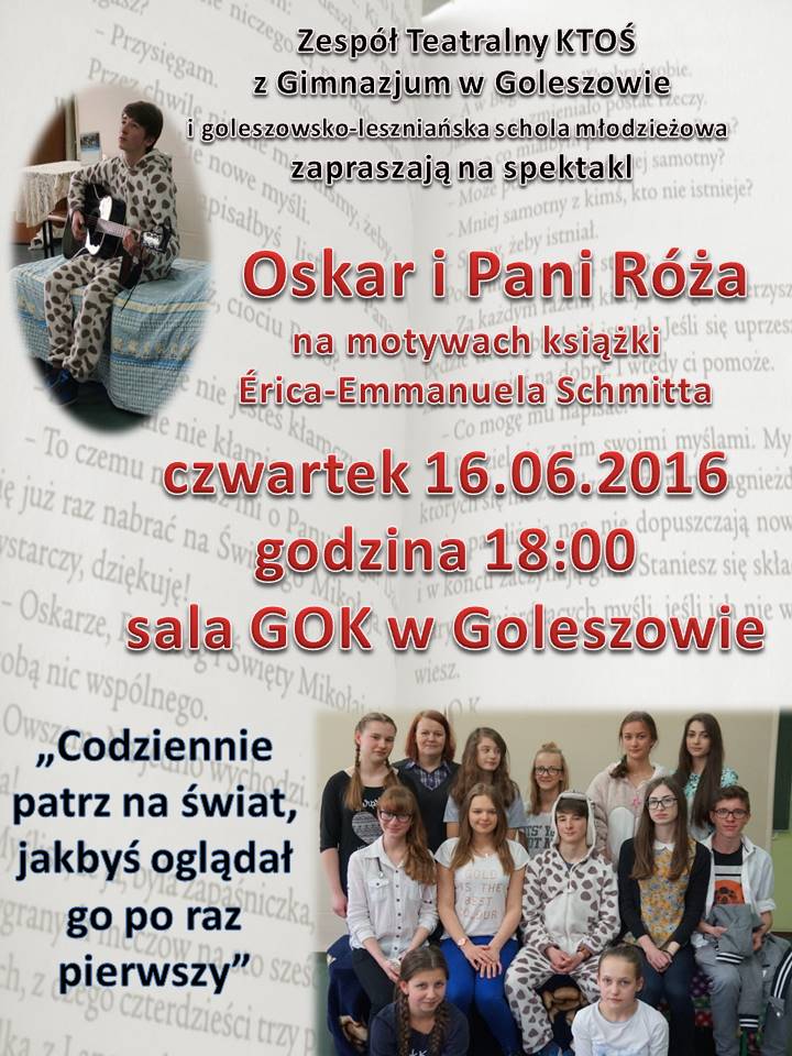 Zespół Teatralny KTOŚ z Gimnazjum w Goleszowie i goleszowsko-leszniańska schola młodzieżowa zapraszają na spektakl "Oskar i Pani Róża" na motywach książki Erica-Emmanuela Schmitta - 16 czerwca, godz. 18.00, Gminny Ośrodek Kultury w Goleszowie