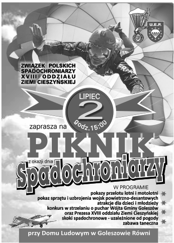Rozpoczęcie o godz. 15.00. W programie pokazy przelotu lotni i motolotni, pokazy sprzętu wojsk powietrzno-desantowych, konkurs w strzelaniu, skoki spadochronowe i mnóstwo innych atrakcji. Na zakończenie zabawa taneczna.