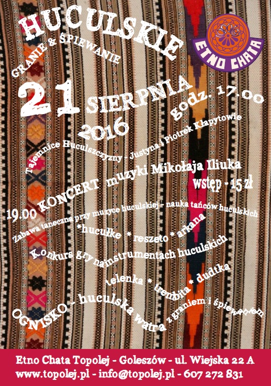 Mamy przyjemność zaprosić na wyjątkowe wydarzenie! Stowarzyszenie AFRICAE DESERTA PROJECT organizuje spotkanie pod nazwą HUCULSKIE GRANIE & ŚPIEWANIE w ramach projektu GÓRALE NA SAHARZE I NOMADZI W BESKIDACH. Spotkanie muzyków z różnych zakątków świata odbędzie się 21 sierpnia w Etno Chacie Topolej.