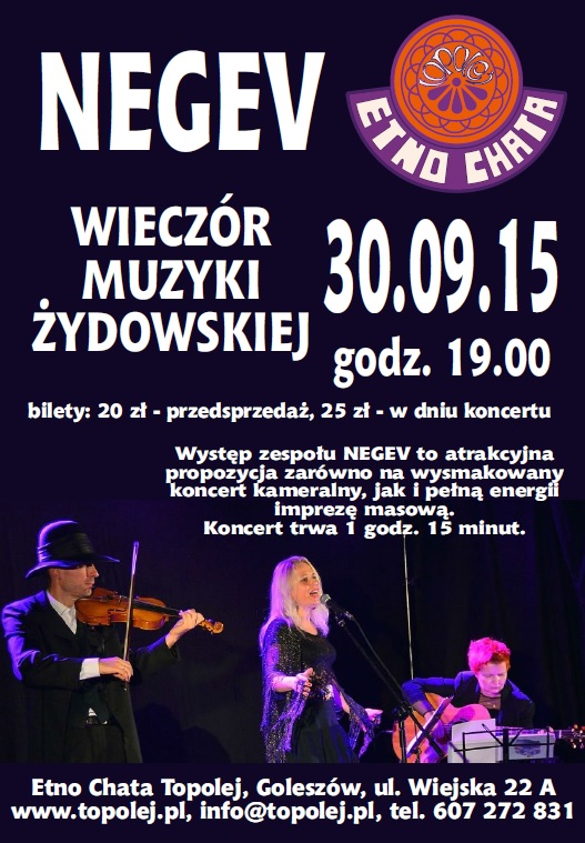 Zespół NEGEV powstał w 2008 roku z inspiracji klimatem i urokiem muzyki żydowskiej. NEGEV łączy wyjątkową muzykalność, pasję i sceniczne doświadczenie. Wokalistką zespołu jest Agnieszka Bielanik-Witomska, piosenkarka przez wiele lat koncertująca w kraju i za granicą z Kabaretem „Pod Egidą” Jana Pietrzaka, a także artystka śląskich teatrów muzycznych – w Gliwicach i w Chorzowie. Na scenie towarzyszą jej: skrzypek Bartłomiej Balcerzak oraz gitarzystka Katarzyna Kupiec. Zespół nawiązuje doskonały kontakt z publicznością – prowadząc z nią swoisty dialog porywa do wspólnego śpiewu, a nawet tańca. Koncerty Zespołu niosą sporą dawkę pozytywnej energii i każdorazowo spotykają się z dużym aplauzem publiczności, a także uznaniem krytyki. Bogaty repertuar koncertu łączy tradycyjne pieśni żydowskie, instrumentalne melodie klezmerskie, pieśni z musicalu „Skrzypek na dachu” oraz piosenki nawiązujące do kultury żydowskiej, jak „Miasteczko Bełz", „Rebeka", „Bubliczki".