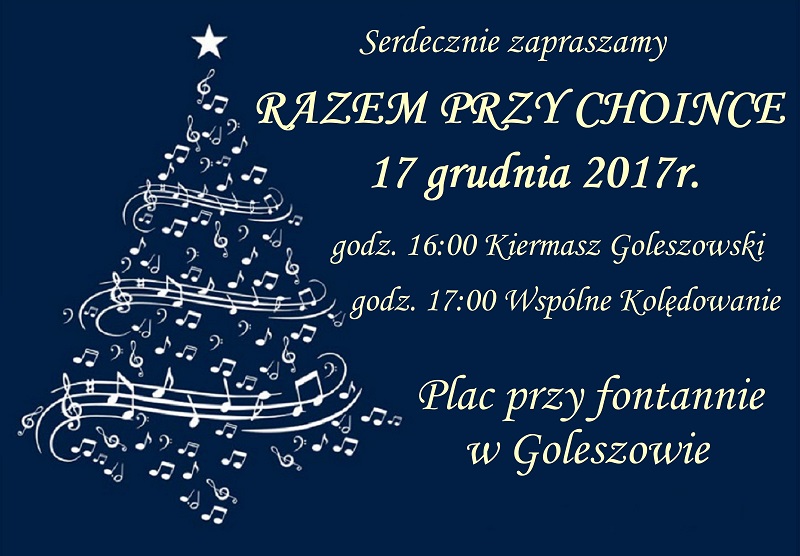 Serdecznie zapraszamy mieszkańców i sympatyków naszej gminy do wspólnego kolędowania przy choince bożonarodzeniowej, które odbędzie się w niedzielę 17 grudnia o godz. 17 na placu przy fontannie w Goleszowie.