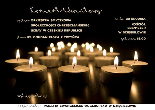Parafia Ewangelicko-Augsburska w Dzięgielowie serdecznie zaprasza 20 grudnia na "Koncert adwentowy". Początek godz. 18.00. Wystąpi Orkiestra smyczkowa społeczności chrześcijańskiej SCEAV z Czech. Słowo wstępne wygłosi ks. Bohdan Taska z Trzyńca. Miejsce: Kościół Eben-Ezer w Dzięgielowie. Wstęp wolny.