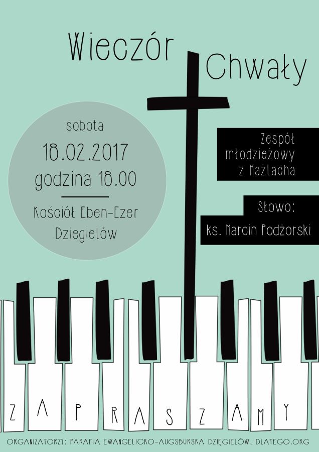 Ogranizatorzy serdecznie zapraszają na Wieczór chwały, który odbędzie się w sobotę 18 lutego o godz. 18.00 w kościele Eben-Ezer w Dzięgielowie.