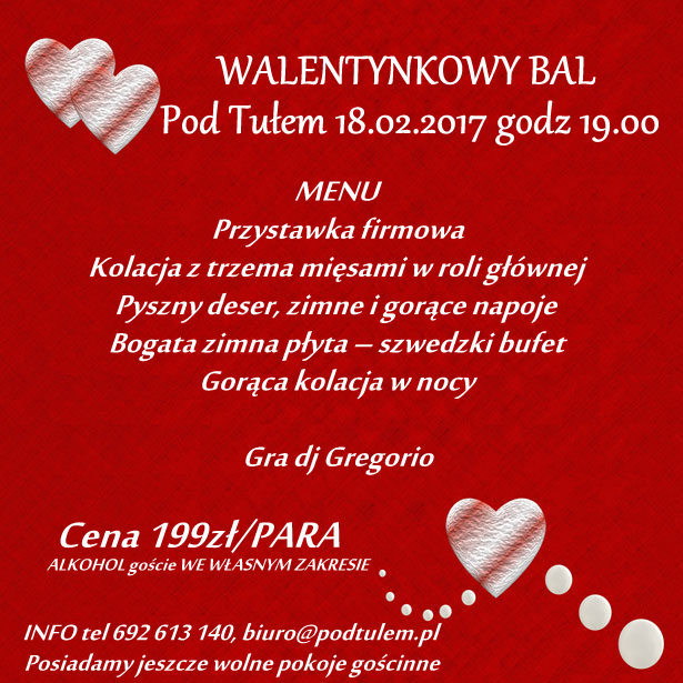 Zapraszamy na Walentynki pod Tułem w Cisownicy - BAL WALENTYNKOWY 18 luty 2017 r. godzina 19.00