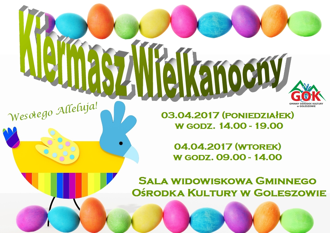 Serdecznie zapraszamy na Kiermasz Świąteczny, który odbędzie się w Gminnym Ośrodku Kultury z Goleszowie w dniu 3 kwietnia w godz. 14.00-19.00 oraz 4 kwietnia w godz. 9.00-14.00.