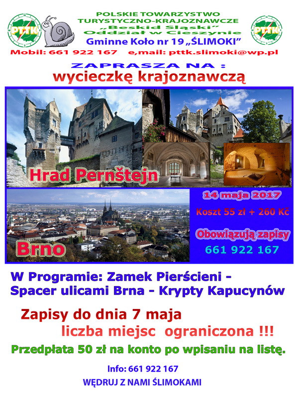 W programie najlepiej zachowany średniowieczny zamek w Czechach, spacer malowniczymi ulicami Brna. Odwiedzimy krypty kapucynów. Głęboko w lasach Masywu Czeskomorawskiego (czes. Českomoravská vrchovina) od przeszło ośmiu wieków wznosi się jeden z najpiękniejszych morawskich zamków. Warto zainteresować się dziejami tej wspaniałej siedziby rodu Pernštejnów, przejść się po jej komnatach i wspiąć na baśniową wieżę. Odważnym turystom być może uda się także spotkać tutejszą Białą Damę. Pernštejn to nie tylko jeden z najważniejszych czeskich zabytków, ale także budowla, która ze względu na swą imponującą architekturę cieszy się niesłabnącym powodzeniem wśród filmowców z całego świata. Poznajcie bliżej tę niezwykłą atrakcję położoną niewiele ponad 100 km od polskiej granicy! Stolica Moraw - Brno jest drugim co do wielkości miastem Republiki Czeskiej i bramą do urodzajnych winnic Moraw Południowych. Starego ratusza miejskiego strzeże dwumetrowy smok, z kolei perłą architektury tego miasta jest funkcjonalistyczna willa Tugendhat zapisana na prestiżowej liście UNESCO. Szczegółowe informacje: Gminne Koło PTTK "ŚLIMOKI", tel. 661 922 167