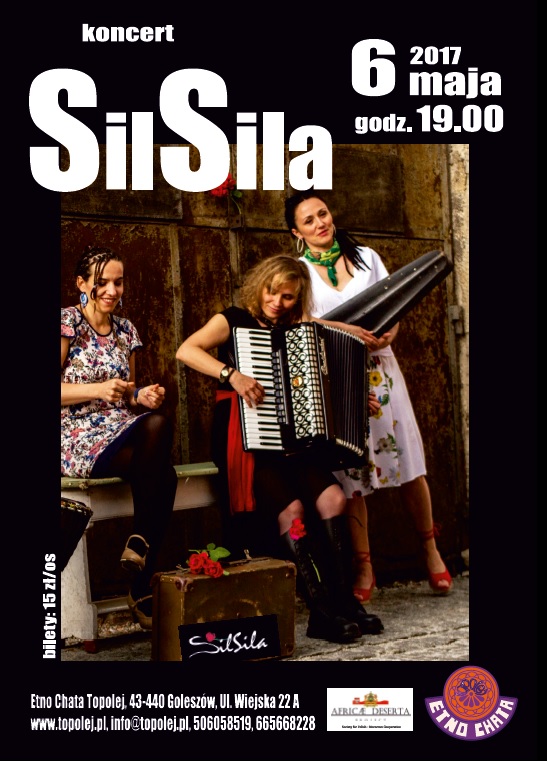 6 maja o godz. 19.00 w muzycznej Etno Chacie Topolej kolejny koncert! Tym razem na scenie wystąpi grupa o intrygującej nazwie SilSila. Wstęp na koncert - 15 zł/os. Zapraszamy gorąco :)!!! Zespół prezentuje autorską muzykę głównie do poezji J.Tuwima, H.Poświatowskiej, W.Broniewskiego, K.I.Gałczyńskiego, E.Dickinson. Twórczość SilSili spotyka sie z entuzjastycznym przyjęciem publiczności w różnym wieku, koncertom towarzyszy wyjątkowa energia. Muzyka to oryginalna mieszanka brzmień - słychać w niej smaczki bałkańskie, elementy flamenco, bossanovę, rocka. We wrześniu 2015 r zespół wydał debiutancką płytę zatytułowaną "Zapach szczęścia" poświęconą w całości poezji J.Tuwima. Nazwa zespołu ma interesujące znaczenie: "Bawiłyśmy się słowami...Sil... Sila ..Zwykła gra słów okazała się mieć ciekawe znaczenie - w j.arabskim to łańcuch, splot zdarzeń. SilSila w sufizmie oznacza również duchowy łańcuch łączący mistrza z uczniem. Mamy nadzieję, że naszą muzyką ożywiamy związki słuchaczy z mądrością, jaką przekazują nam w swojej poezji mistrzowie słowa " Zespół tworzą :Agnieszka Korbel (wokal), Monika Bielińska-Wawoczny (akordeon), Neszka Plebanek (gitara basowa), Grzegorz Kozłowski (perkusja i inst. perkusyjne), Adam Grześkiewicz (gitara).