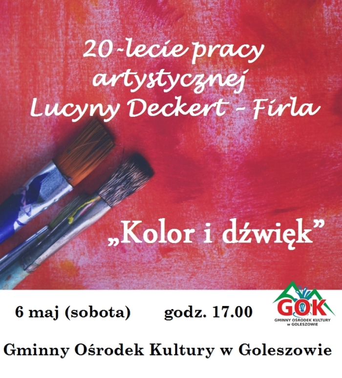6 maja o godz. 17.00 w Gminnym Ośrodku Kultury w Goleszowie odbędzie się wernisaż wystawy pt. "Kolor i dźwięk" z okazji 20-lecia pracy artystycznej Lucyny Deckert-Firla. Serdecznie zapraszamy