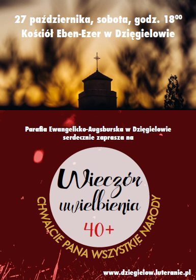 Parafia Ewangelicko - Augsburska w Dzięgielowie serdecznie zaprasza 27 października o godz. 18.00 na WIECZÓR UWIELBIENIA 40 + CHWALCIE PANA WSZYSTKIE NARODY. Miejsce: Kościół Eben-Ezer w Dzięgielowie. Wstep wolny.