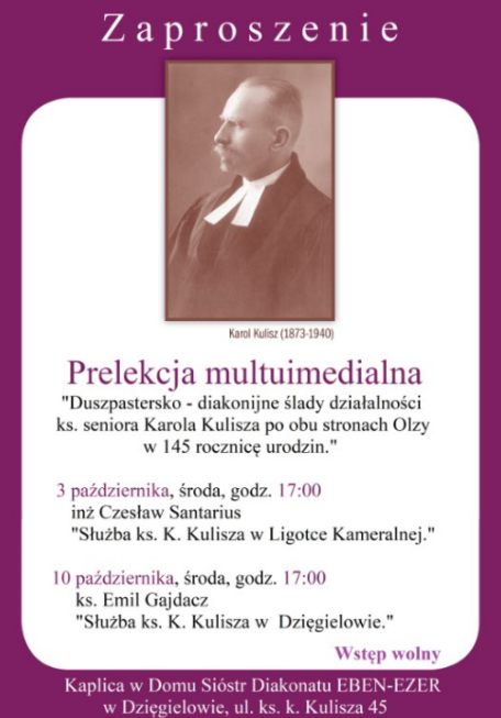 Parafia ewangelicka oraz diakonat Eben-Ezer z Dzięgielowa serdecznie zapraszają 3 października o godz. 17.00 na prelekcję multimedialną oraz wykład Czesława Santariusa o służbie księdza Kulisza w Ligotce Kameralnej, zaś 10 października o godz. 17.00 na wygład ks. Emila Gajdacza o służbie księdza Kulisza w Dzięgielowie. Miejsce: kaplica w Domu Sióstr Diakonatu Eben-Ezer, ul. Ks. Kulisza 45, Dzięgielów,. Wstęp wolny
