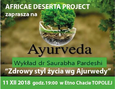 Stowarzyszenie Współpracy Polsko-Marokańskiej AFRICAE DESERTA PROJECT serdecznie zaprasza wszystkich zainteresowanych tematyką zdrowia na wykład pt: "Zdrowy styl życia według Ajurwedy", który poprowadzi dr Saurabh Pardeshi - ekspert w diagnostyce z pulsu. To wyjątkowe spotkanie, podczas którego dr Saurabh Pardeshi przedstawi tajniki medycyny ajurwedyjskiej, zaproponuje nam proste wskazówki i praktyki, pozwalające zachować w naszym życiu harmonię i równowagę. Ajurwedyjska unikalna koncepcja zdrowia, postrzega bowiem człowieka w sposób holistyczny – jako połączenie ciała, umysłu i duszy.