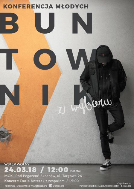 Parafia Ewangelicko-Augsburska w Dzięgielowie i dlatego.org serdecznie zapraszają na konferencję i koncert "Buntownik z wyboru". Poczatek godz. 12.00. Miejsce: Skoczów, MCK Pod Pegazem, ul. Targowa 26. Koncert Daria Antczak z zespołem