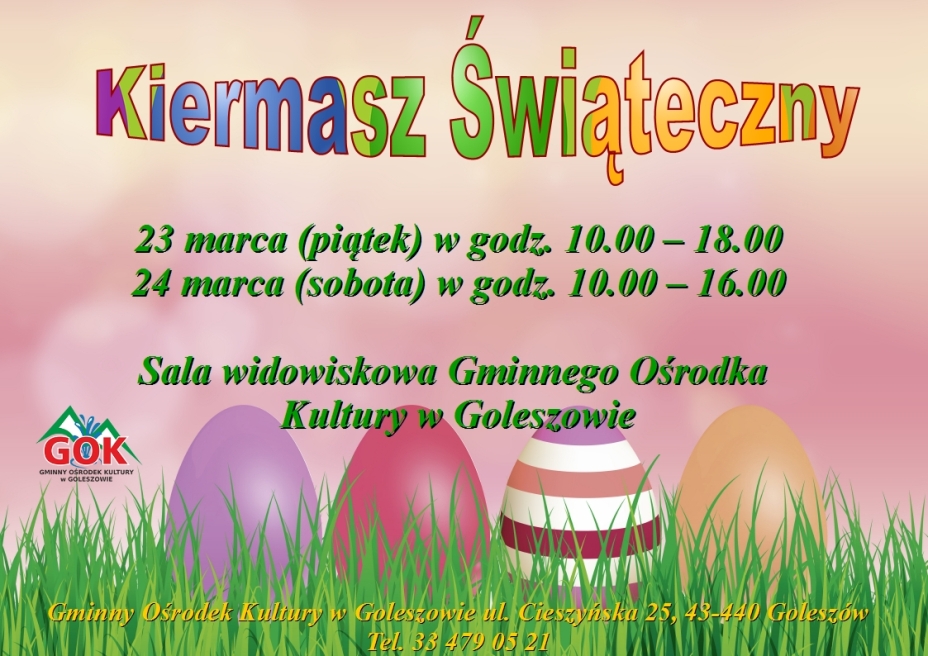 GOK Goleszów zaprasza na Kiermasz Wielkanocny! 23 marca (piątek) w godz. 10.00 - 18.00; 24 marca (sobota) w godz. 10.00-16.00. Będzie możliwość zakupu rękodzieła artystycznego i ozdób wielkanocnych. Zapraszamy!