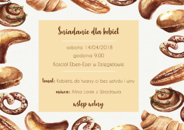 Parafia ewangelicka z Dzięgielowa serdecznie zaprasza 14 kwietnia na "Śniadanie dla kobiet". Temat: Kobieto, do twarzy ci bez wstydu i winy. Mówca: Alina Lorek z Wrocławia. Miejsce: Kościół Eben-Ezer w Dziegielowie (ul. Ks. Kulisza). Początek godz. 9.00. Wstęp wolny.