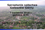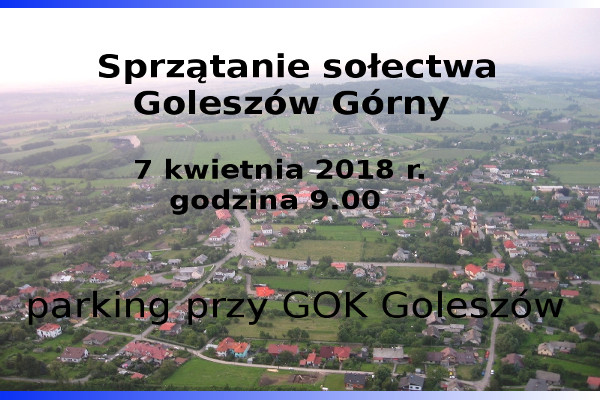 Zapraszamy mieszkańców do wspólnego sprzątania naszego sołectwa. Czekamy na Was w sobotę 7 kwietnia o godz. 9 00 na parkingu przy Gminnym Ośrodku Kultury w Goleszowie: Zakończenie około godz. 13.00 nad Tonem przy wspólnym grillowaniu. Elżbieta Duraj, Dorota Branny i Tomasz Polak