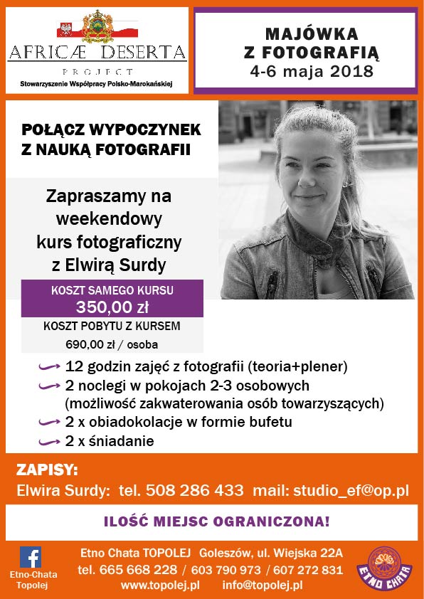 Africae Deserta serdecznie zaprasza na 3 dniowe warsztaty fotograficzne z Elwirą Surdy (fotograf, operator filmowy, reżyser).