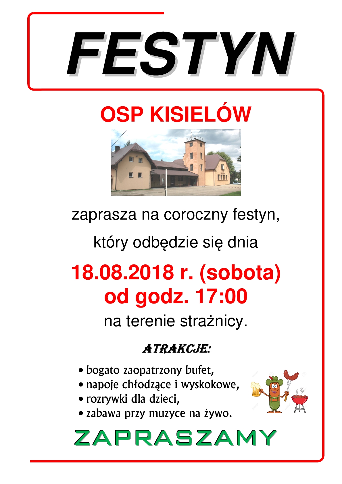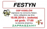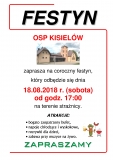 Zarząd OSP w Kisielowie ma zaszczyt zaprosić mieszkańców okolicznych miejscowości na coroczny festyn strażacki, który odbędzie się na terenie naszej strażnicy w sobotę 18 sierpnia 2018 r. Szczegóły na plakacie. ZAPRASZAMY