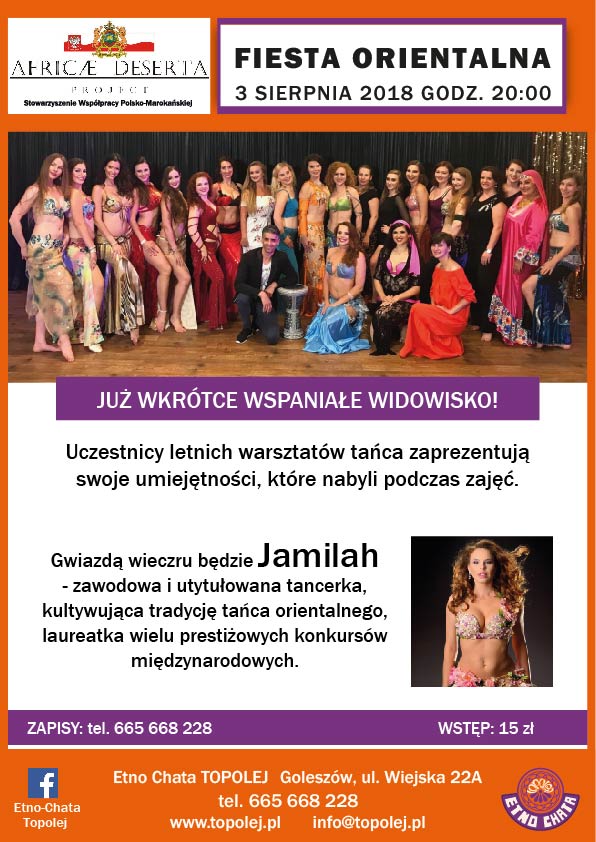 Serdecznie zapraszamy na niezwykły pokaz tańca orientalnego. Już 3 sierpnia odbędzie się Fiesta Orientalna podczas której wystąpi Jamilah, czyli Małgorzata Gil-Manzel oraz uczestnicy jej warsztatów. To wspaniałe widowisko odbędzie się w piątek (3 sierpnia) w Etno Chacie TOPOLEJ. Zapisy pod numerem telefonu: 665 668 228 ZAPRASZAMY!