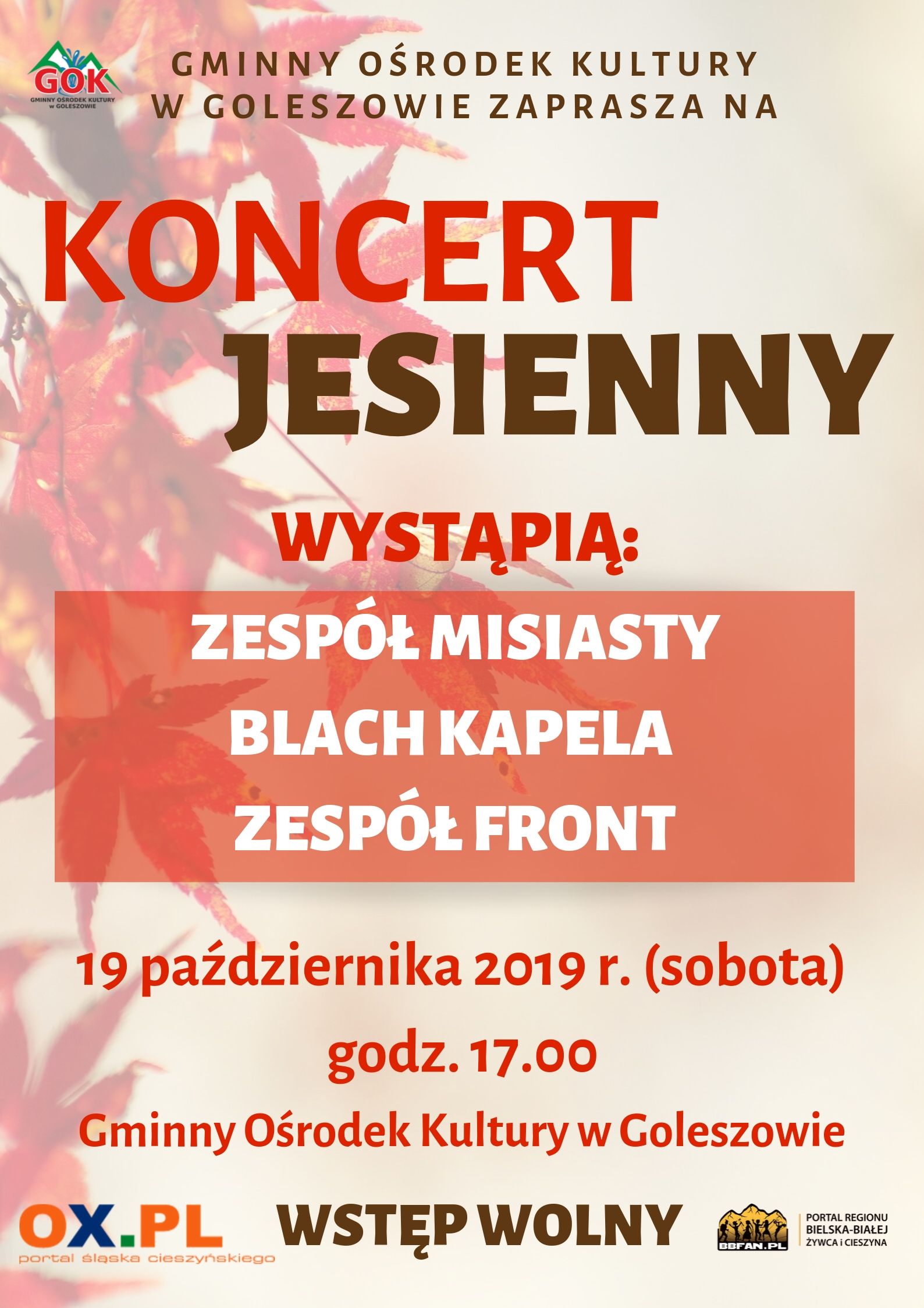 Gminny Ośrodek Kultury w Goleszowie zaprasza na KONCERT JESIENNY, który odbędzie się 19 października (sobota) o godz. 17.00 na sali widowiskowej GOK. Podczas koncertu wystąpią zespoły: MISIASTY BLACH KAPELA FRONT Wstęp wolny! Zapraszamy