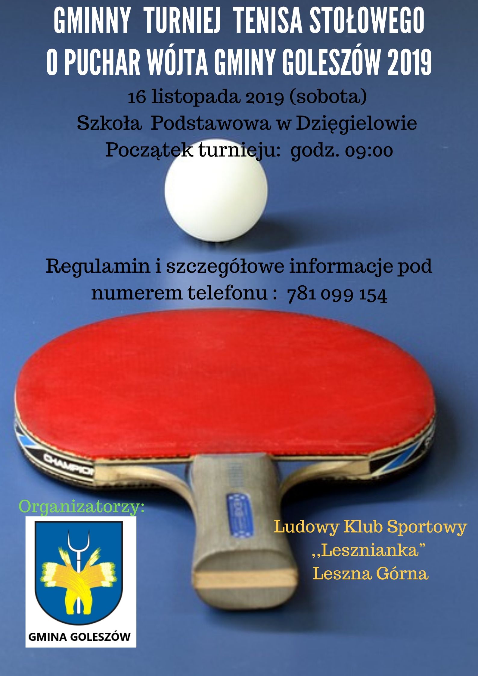16 listopada w Szkole Podstawowej w Dzięgielowie odbędzie się Turniej Tenisa Stołowego o Puchar Wójta Gminy Goleszów Sylwii Cieślar. Rozgrywki rozpoczną się o godz. 9.00. Zawodnicy rywalizować będą w kilku kategoriach. Szczegółowe informacje i zapisy: tel. 781 099 154