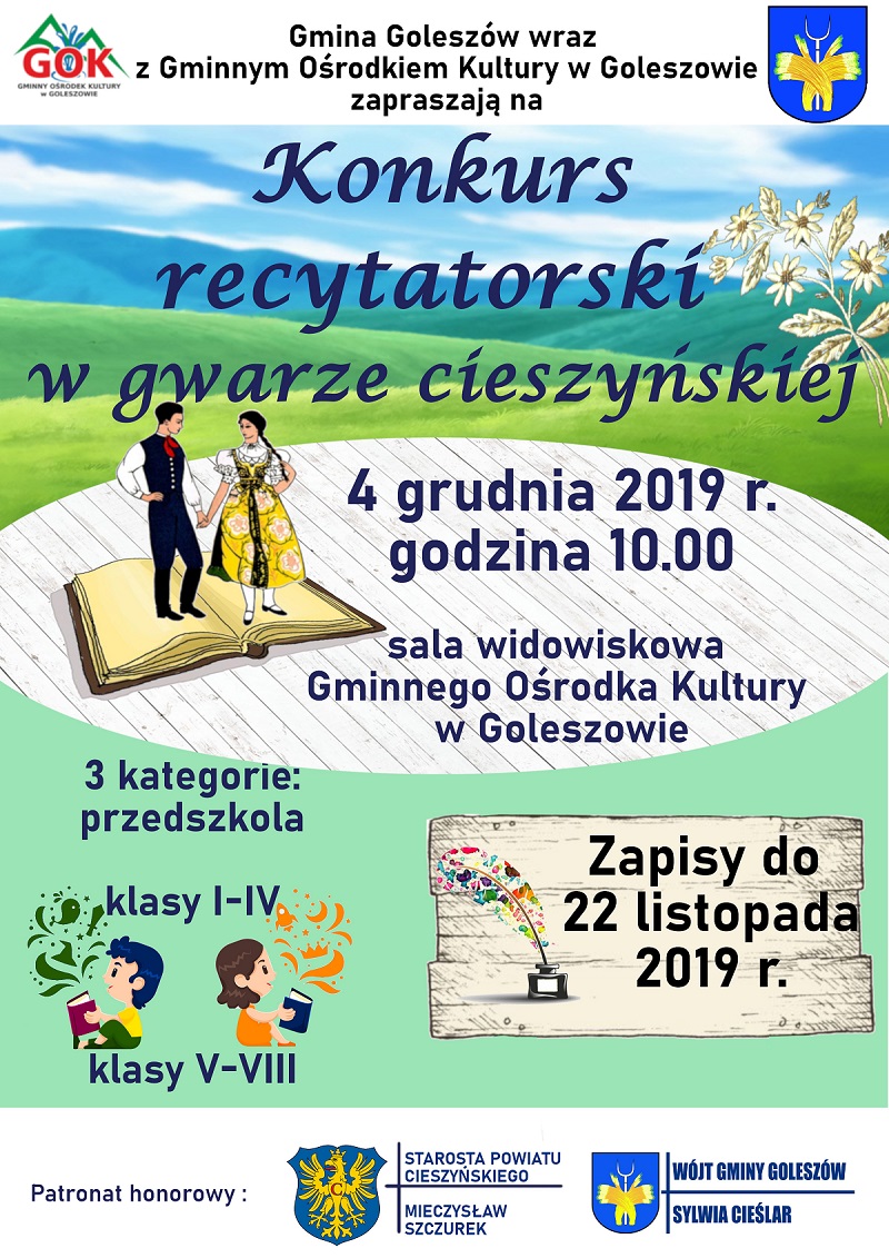 Gminny Ośrodek Kultury w Goleszowie oraz Gmina Goleszów zapraszają dzieci z przedszkoli i szkół podstawowych klas I - VIII do wzięcia udziału w Konkursie Recytatorskim w Gwarze Cieszyńskiej, który odbędzie się w dniu 4 grudnia 2019 o godz. 10.00 w sali widowiskowej GOKu.