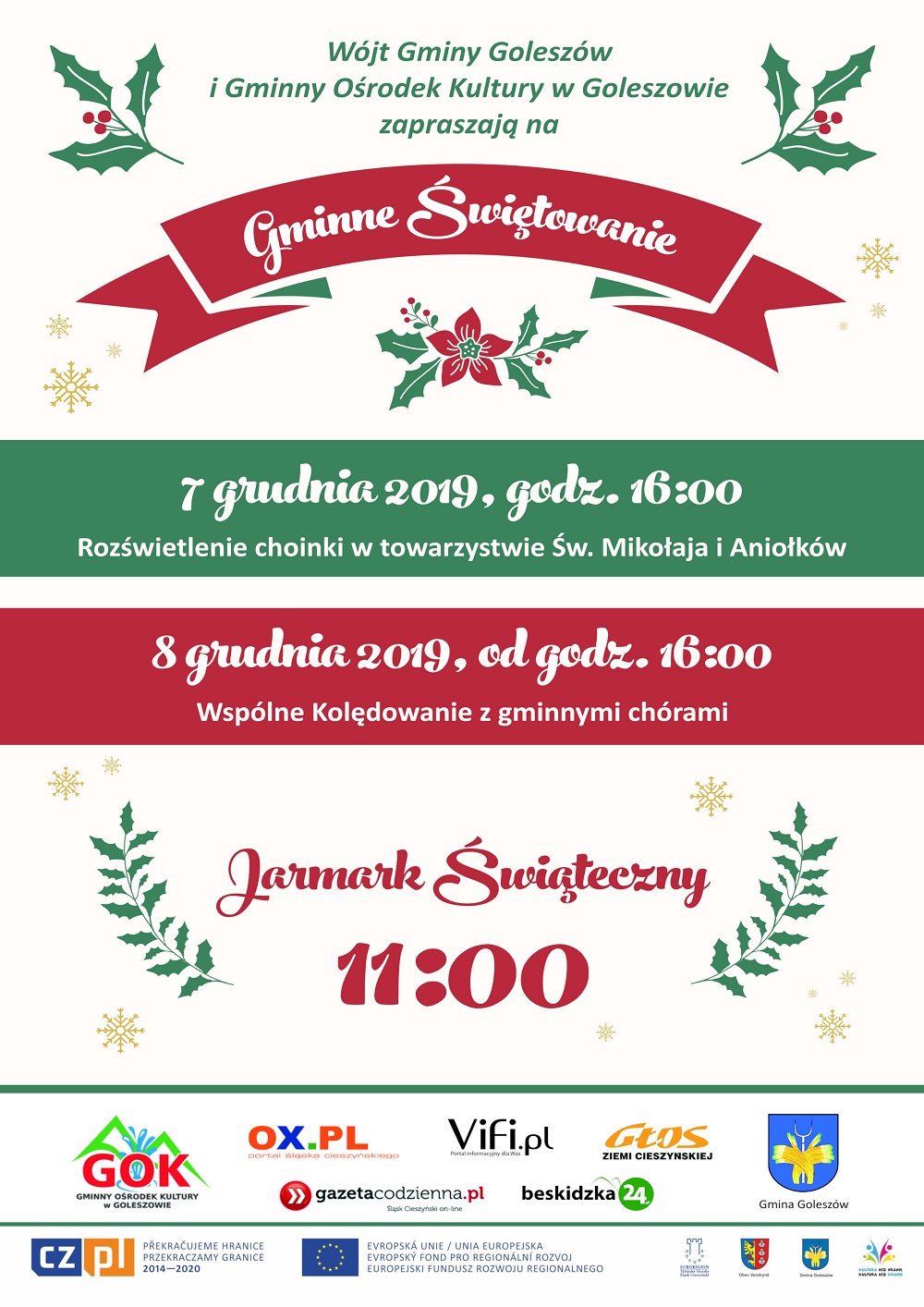 Wójt Gminy Goleszów Sylwia Cieślar wraz z Gminnym Ośrodkiem Kultury w Goleszowie pragną zaprosić wszystkich mieszkańców gminy Goleszów na uroczyste rozświetlenie choinki oraz wspólne kolędowanie. Dwudniowa impreza, której towarzyszyć będą występy artystyczne oraz bożonarodzeniowy jarmark odbędzie się w sobotę i niedzielę, 7 i 8 grudnia na placu przed Urzędem Gminy w Goleszowie