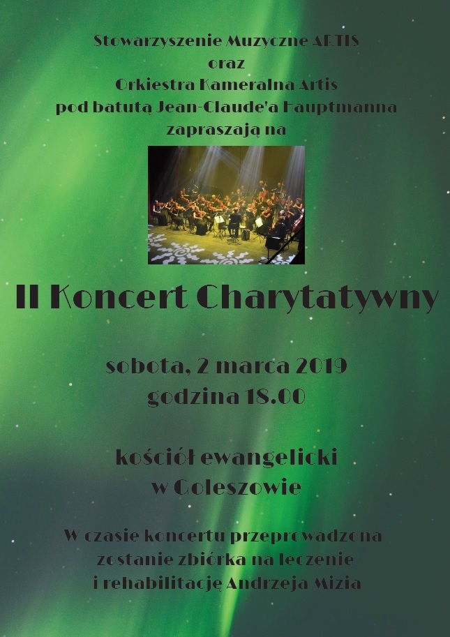 Stowarzyszenie Muzyczne ARTIS organizuje II Koncert Charytatywny, którego wykonawcą będzie Orkiestra Kameralna Artis pod batutą Jean-Claude'a Hauptmanna.