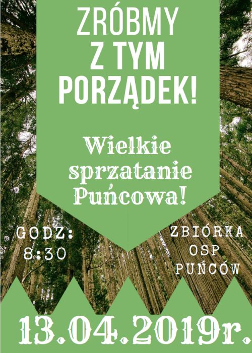 13 kwietnia 2019 r. odbędzie się sprzątanie Puńcowa. Początek akcji godz. 8.30 przy OSP Puńców.