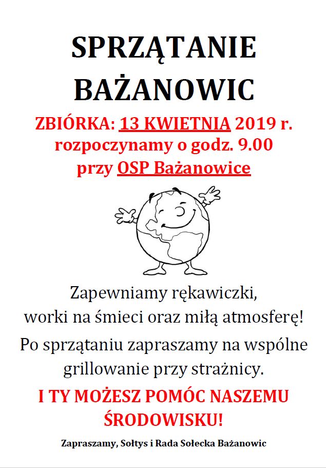 13 kwietnia 2019 r. odbędzie się sprzątanie Bażanowic. Rozpoczynamy o godz. 9.00 przy OSP Bażanowice. Zapewniamy rękawiczki, worki na śmieci oraz miłą atmosferę! Po sprzątaniu zapraszamy na wspólne grillowanie przy strażnicy I Ty możesz pomóc naszemu środowisku! Zapraszamy - sołtys i rada sołecka