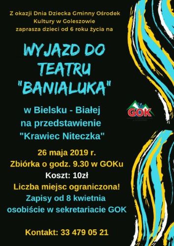 Gminny Ośrodek Kultury w Goleszowie organizuje w dniu 26 maja wyjazd do Teatru Banaluka w Bielsku-Białej na przedstawienie "Krawiec Niteczka"