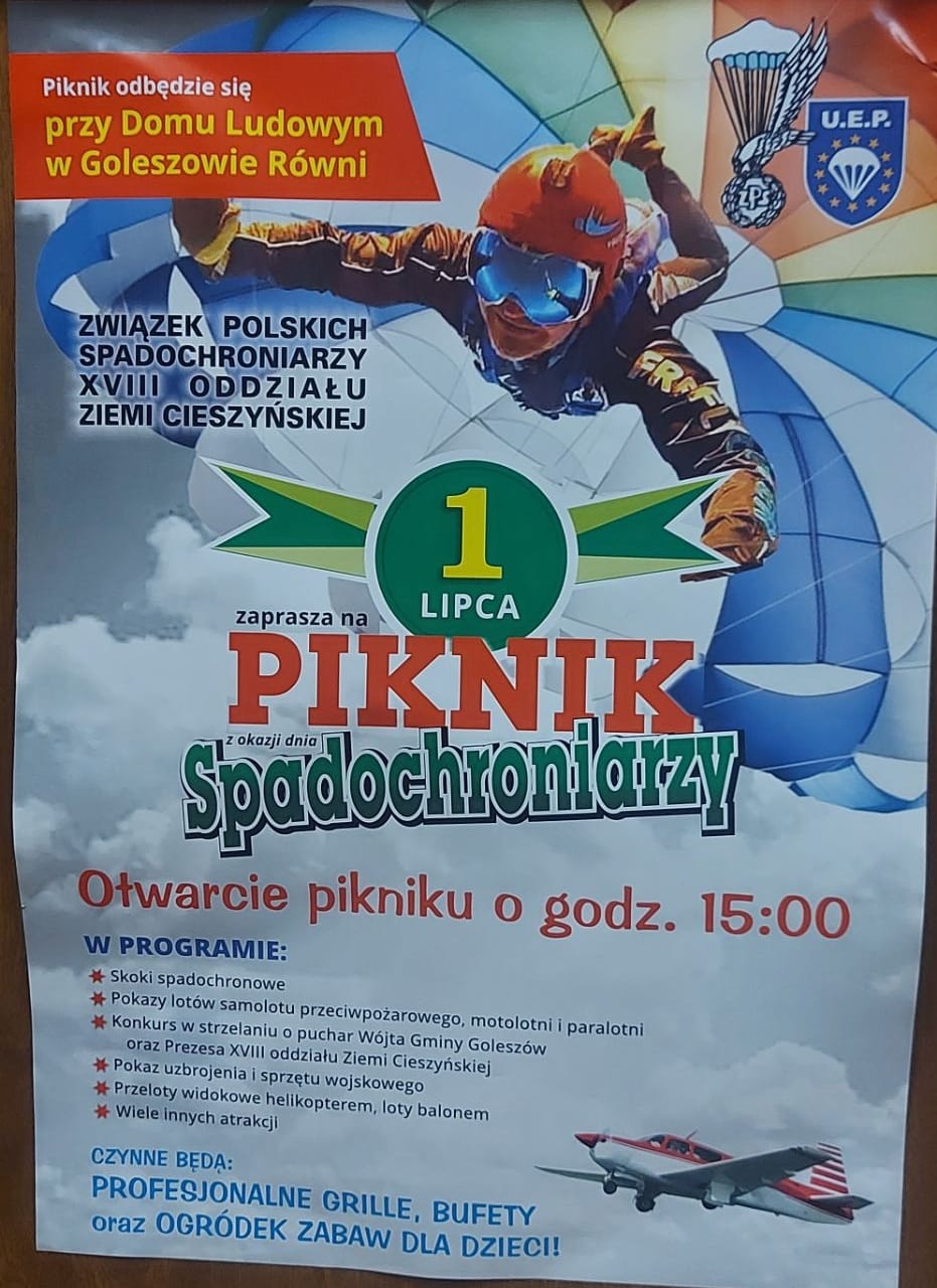 XVIII Oddział Ziemi Cieszyńskiej Związku Spadochroniarzy Polskich zaprasza na piknik z okazji Dnia Spadochroniarzy, który odbędzie się w sobotę, 1 lipca przy Domu Ludowym w Goleszowie Równi. Początek imprezy zaplanowany jest na godz. 15:00.