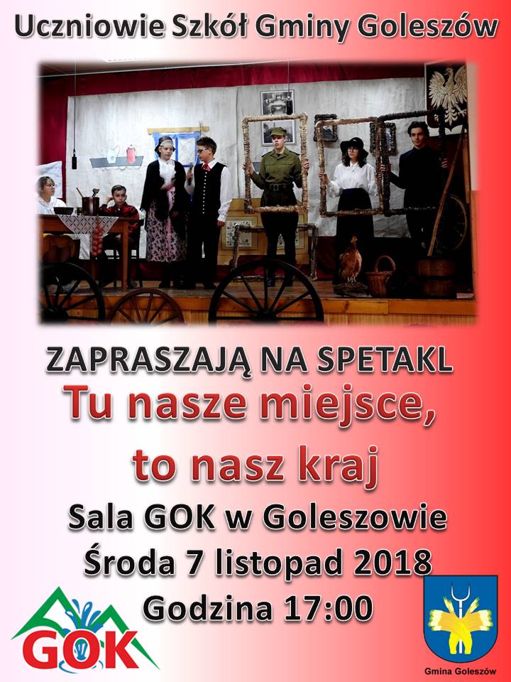 7 listopada o godz. 17.00 w Gminnym Ośrodku Kultury w Goleszowie odbędzie sie spektakl „Tu nasze miejsce, to nasz kraj”, w wykonaniu młodych artystów z gminnych placówek oświatowych. Organizatorzy serdecznie zapraszają. Wstęp wolny!